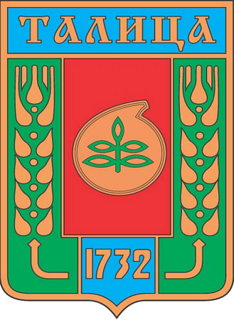 Герб города Талица, принятый 15 июля 1982 года. В центре герба на красном фоне изображена реторта, внутри которой зеленый росток. По бокам золотые колосья, ниже дата 1732. В верхней части на синей полосе написано название города.