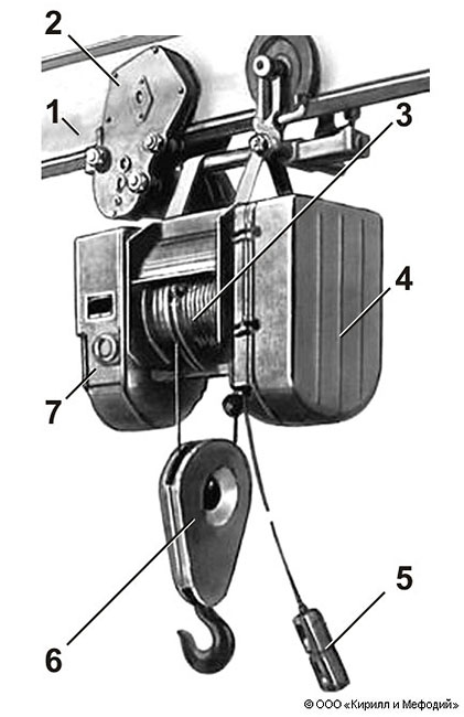 Электрическая передвижная таль: 1 — двутавровый путь; 2 — приводная тележка; 3 — барабан со встроенным электродвигателем; 4 — шкаф электроаппаратуры; 5 — пульт управления; 6 — крюковая подвеска; 7 — редуктор с тормозом.