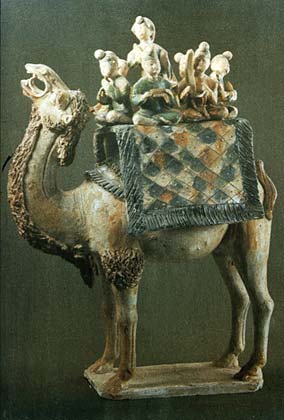 Тан. Особое место в танских погребальных комплексах отводится животным. Верблюд, везущий на своей спине семейство странствующих музыкантов, резко вскидывает морду.