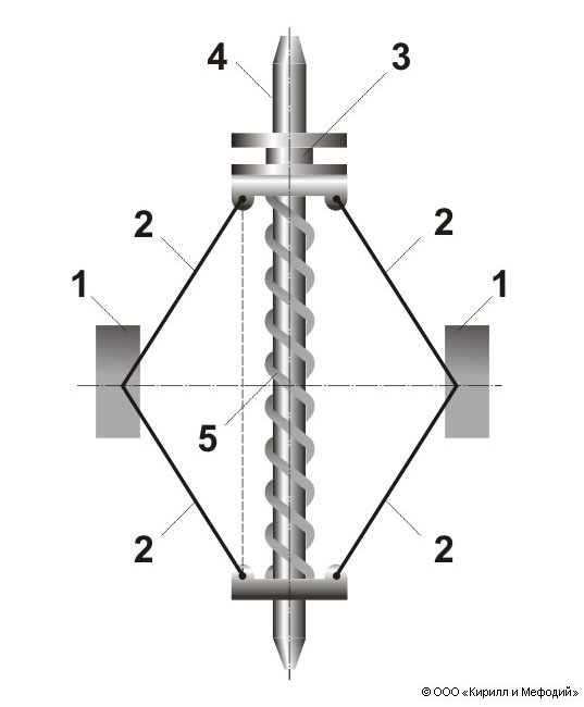 Кинематическая схема механического центробежного тахометра: 1 — грузы; 2 — рычаги; 3 — скользящая муфта; 4 — вал; 5 — пружина.