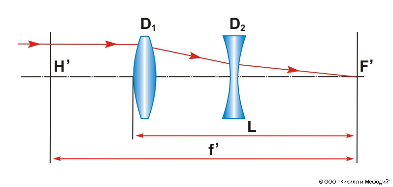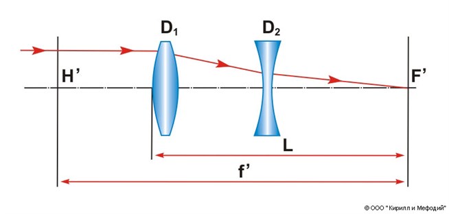 Принципиальная схема двухкомпонентного объектива. H' — задняя главная плоскость; F' — задняя фокальная плоскость; D1 — положительный объект телеобъектива; D2 — отрицательный компонент телеобъектива; L — расстояние от первой поверхности телеобъектива до задней фокальной плоскости; f' - заднее фокусное расстояние.