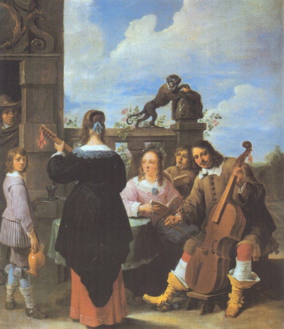 Давид Тенирс. Художник с семьей. 1645-1648 годы. Доска, масло, переведено на холст. Галерея Ноортман, Маастрихт. На картине Тенирс изобразил свою семью: сам он играет на виолончели, его жена Анна Брегель держит ноты в руках, сын Давид поет, слева — сын Абрам.