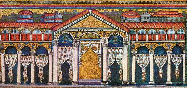 Дворец Теодориха в Равенне. Мозаика на стене центрального нефа базилики Сант-Апполинаре-Нуово в Равенне. Строительство дворца относят к 510-520 гг.