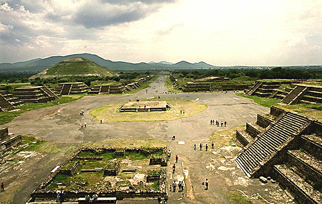 Теотиукан — один из крупнейших центров доколумбовых цивилизаций Центральной Америки (2 в. до н.э. — 7 в. н.э.), находится недалеко от современного Мехико. Два главных храма города посвящены Солнцу и Луне. Они располагаются на вершинах огромных ступенчатых пирамид. Храмы были украшены разноцветными росписями и ярко раскрашенными изваяниями богов. Общий вид. Слева от «Дороги мертвых» стоит Пирамида Солнца.