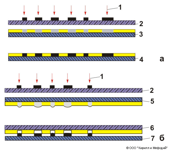 Схемы процессов термокопирования: а — прямого, б — косвенного, или переносного; 1 — инфракрасные лучи; 2 — оригинал (непрозрачные элементы изображения зачернены); 3 — термореактивная бумага (чувствительный слой не заштрихован); 4 — термокопия (после химической реакции); 5 — термокопировальная бумага (чувствительный слой не заштрихован); 6 — термокопировальная бумага после копирования; 7 — термокопия.