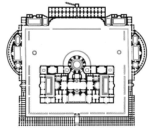 Термы Каракаллы (план), сооруженные в 202-216 годах, отличались колоссальным размером и роскошью архитектурного декора. Там были обнаружены знаменитые статуи Геркулеса и Флоры и скульптурная группа Фарнезский бык. В 1960 они стали объектом, где проводились состязания по одному из видов XVII летних Олимпийских игр в Риме.