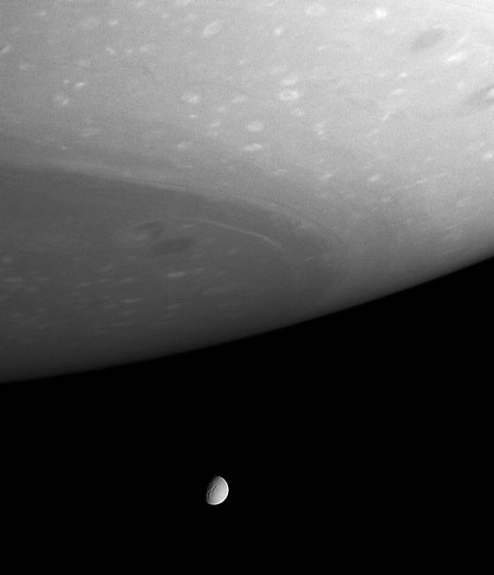 Тефия и Сатурн. Фотография сделана АМС «Кассини» 18 октября 2004 с расстояния 3, 9 млн. км от планеты.