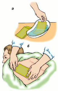 Техника постановки горчичников: а) смачивание горчичников; б) накладывание их.