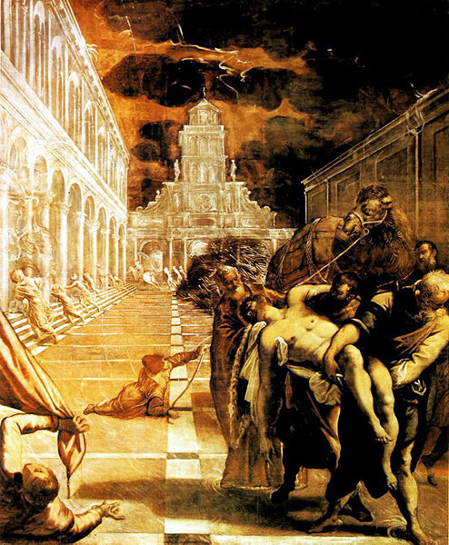 Тинторетто. «Спасение тела Святого Марка». 1562-1566. Галерея Академии, Венеция. В 1562 Тинторетто начинает свой знаменитый цикл, посвященный легенде о Святом Марке, покровителе Венеции. Картины Тинторетто построены на диагоналях и кривых взлетах композиции, смелых ракурсах и неожиданных позах; колорит — на чисто венецианских противопоставлениях густых сверкающих тонов переднего плана и нейтрального фона. Тяга к трагическим конфликтам, пластической мощи и страстной динамике форм и цвета роднит Тинторетто с Микеланджело.