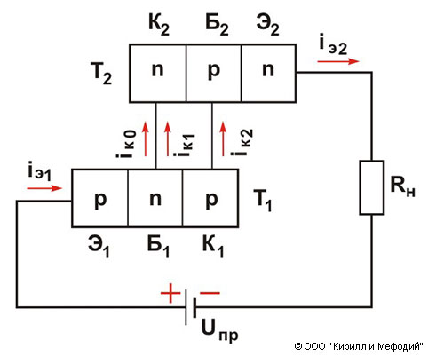 Схематическое изображение тиристора в виде двух включенных навстречу друг другу транзисторов: Т — транзистор; Э — эмиттер; Б — база; К — коллектор; iэ — эмиттерный ток; iк — коллекторный ток; iкo — ток коллекторного перехода; Rн — сопротивление внешней цепи; Uпp — прямое напряжение на тиристоре.