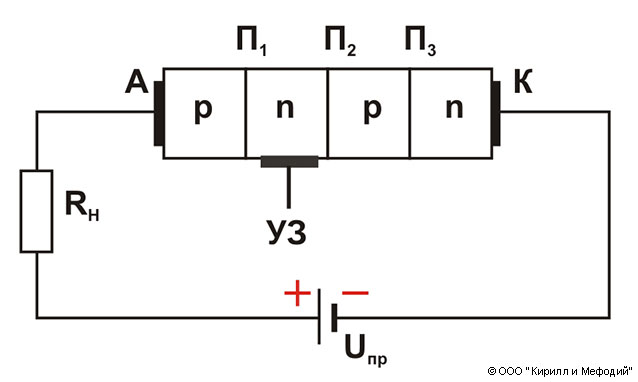 Схематическое изображение тиристора: А — анод; К — катод; УЭ — управляющий электрод; П — электронно-дырочный переход; Rн — сопротивление внешней цепи; Uпp — прямое напряжение на тиристоре.
