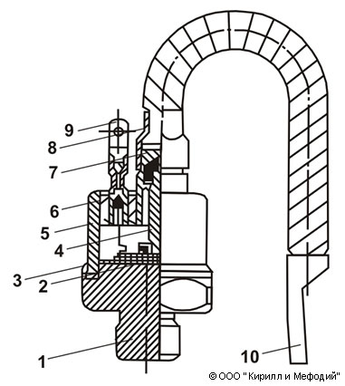 Управляемый тиристор (в разрезе): 1 — основание (силовой электрод); 2 — полупроводниковый кристалл; 3 — фторопластовое кольцо; 4 — гибкий внутренний провод; 5 — крышка; 6 — изолятор крышки; 7 — стержень крышки; 8 — гибкий наружный вывод (силовой электрод); 9 — управляющий электрод; 10 — наконечник наружного вывода.
