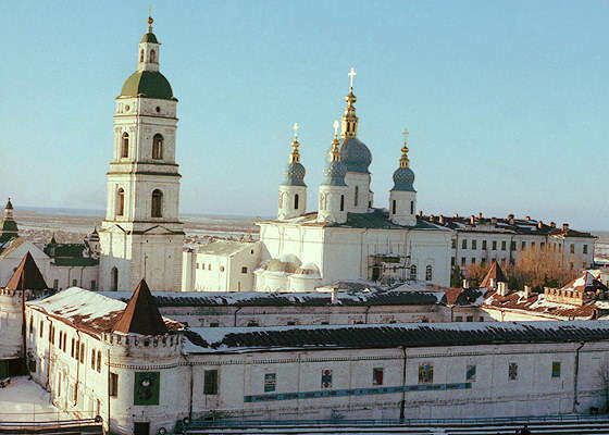 Тобольский кремль. В ансамбле доминирует величественный пятиглавый Софийско-Успенский собор, построенный в 1681-1686 гг. (самое древнее каменное здание Сибири) с соборной колокольней 1794-97 гг. В соборе — усыпальница первых церковных иерархов Сибири.