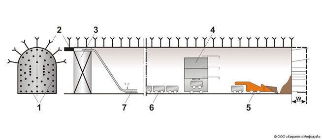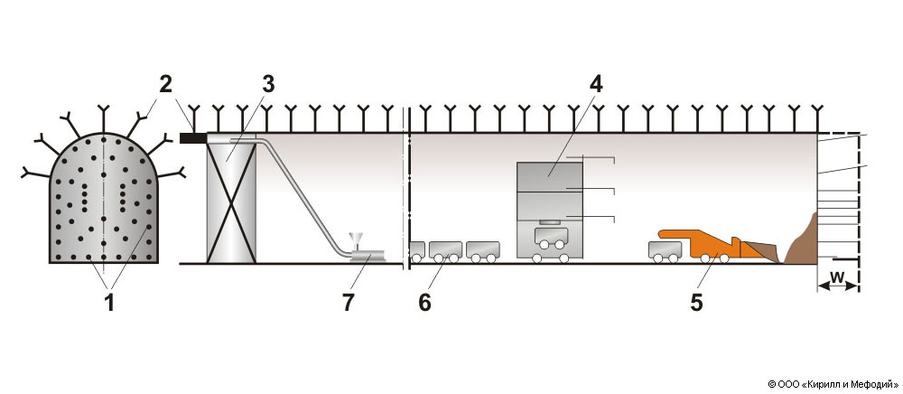 Способ сплошного забоя: 1 — шпуры; 2 — анкерная крепь; 3 — передвижная опалубка; 4 — буровая рама с перестановщиком вагонеток; 5 — породопогрузочная машина; 6 — вагонетки; 7 — бетононасос; W — глубина заходки.