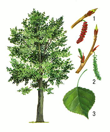Тополь черный: 1 — побег с мужской сережкой; 2 — побег с женской сережкой; 3 — лист.