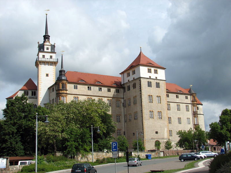 Торгау. Замок Хартенфельс (Schloss Hartenfels). Резиденция саксонских курфюрстов из дома Веттинов. Построен в конце 15 — начале 16 в. в стиле раннего ренессанса. В 1544 в замке Мартином Лютером была освящена первая в мире протестантская церковь.