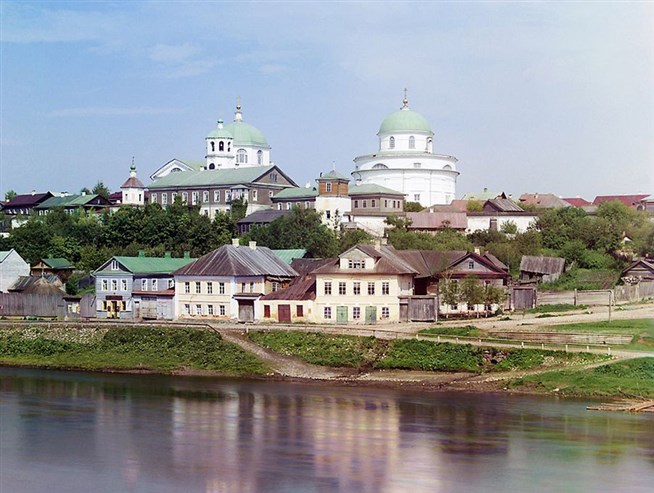 Торжок, набережная Тверцы. На заднем плане Воскресенский монастырь. 1910 год. Фотография С.М. Прокудина-Горского.