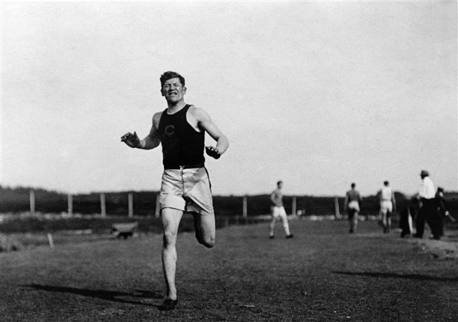 На Олимпиаде в Стокгольме (1912) американский атлет Джим Торп завоевал две золотые медали. Позднее за участие в профессиональных бейсбольных матчах у него были отобраны эти медали. И только после смерти великого спортсмена справедливость была восстановлена, но медали вернули уже наследникам. На фотографии Джим Торп готовится к Олимпиаде на Стокгольмской трассе. 1912 год. Фото: Cumberland County Historical Society, Карлайл.