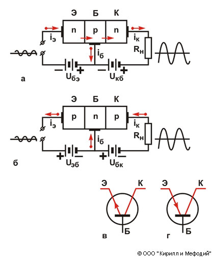 Схематичное изображение транзисторов n — p — n-типа (а) и p — n — p-типа (б) в схеме усилителя электрических колебаний и условные обозначения их на электрических схемах (в, г): Э — эмиттер; Б — база; К — коллектор; Rн — нагрузка; U — напряжение источников питания; i — ток; стрелками обозначено направление движения электронов (противоположное направлению тока).