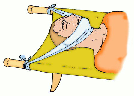 Транспортировка пострадавшего при переломах шейного отдела позвоночника с использованием косынки.