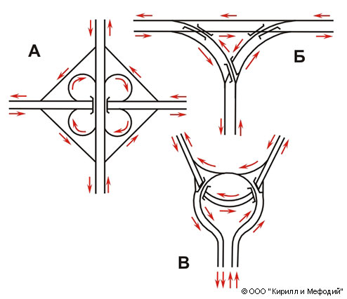 Схемы транспортных развязок: а — пересечение по типу клеверного листа; б — Т-образный тип примыкания; в — кольцевой тип разветвления.