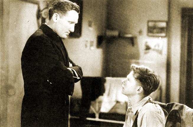 Спенсер Трейси в роли священника и юный талант Микки Руни в фильме «Город мальчиков» (Boys Town). 1939 год.