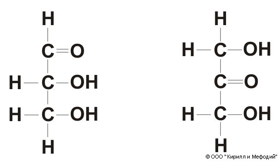 Структурная формула триозов. Слева - D-глицериновый альдегид (альдоза), справа — диоксиацетон (кетоза).