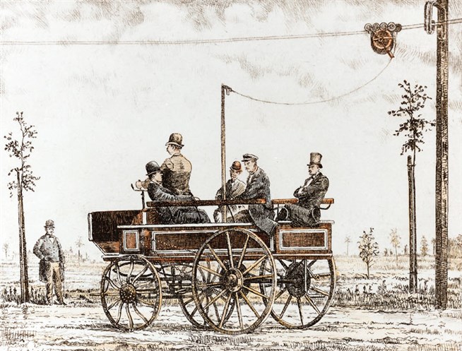 Первый троллейбус, фото 1882. Спроектирован Вернером фон Сименсом, назван — Electromote. Берлин Курфюрстендамм.
