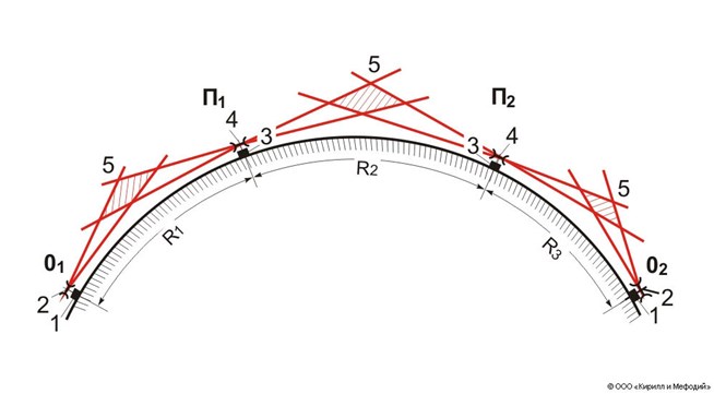 Схема радиорелейной линии тропосферной связи: О и П — оконечная и промежуточная приемо-передающие радиостанции; R — расстояние между станциями (по дуге земной поверхности); 1, 3 — радиопередатчики и радиоприемники оконечных и промежуточных станций; 2, 4 — приемо-передающие антенны оконечных и промежуточных станций; 5 — переизлучающие области тропосферы.