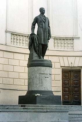 Памятник Габдулле Тукаю в Казани. Скульптор Е. Шулик. Пямятник установлен в специально оформленном полукружии бокового фасада Татарского театра оперы и балета.