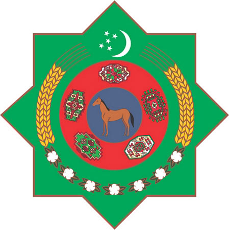 Герб Туркмении, принятый 15 августа 2003 года представляет собой восьмигранник зеленого цвета с желто-золотистой каймой, в который вписаны два круга голубого и красного цветов. Круги разделены между собой желто-золотистыми полосами. На зеленом фоне восьмигранника вокруг красного круга изображены основные элементы национального богатства и символики госудаpства: в нижней части — семь раскрытых пятистворчатых коробочек белого хлопка с зелеными листьями; в средней части — колосья пшеницы; в верхней части — полумесяц с пятью пятиконечными звездами белого цвета. На кольцевой полосе красного круга изображены по ходу часовой стрелки пять основных ковровых гелей: ахалтеке, салыр, эрсары, човдур, йомуд. В голубом круге изображен Янардаг — конь ахалтекинской породы Сапармурата Ниязова. В 1992-2003 годах герб Туркмении имел круглую форму.