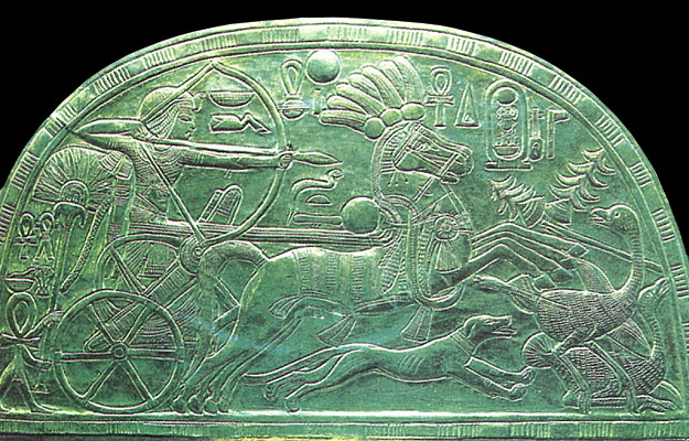 Пластинка опахала из гробницы Тутанхамона с изображением охоты фараона на страусов. Ок. 1345 до н. э.