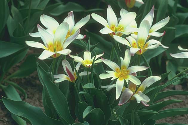 Тюльпан Кауфмана (Tulipa kaufmanniana) с цветками, напоминающими лилии.