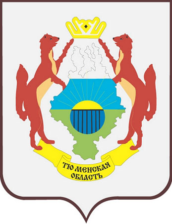 Герб Тюменской области был принят 15 апреля 1996 года. В центре серебряного геральдического герба находится абрис (контур) Тюменской области, расцвеченный белой, синей, зеленой полосами. В центре абриса круг, верхняя часть которого — золотое диск восходящего солнца с золотыми лучами, а нижняя расчерчена синими (широкими) и черными (узкими) вертикальными полосками. Над абрисом золотая корона, составленная из элементов традиционных орнаментов северных народов области. Внизу золотая лента с надписью черного цвета «Тюменская область». По сторонам — соболя, поддерживающие абрис области и корону.