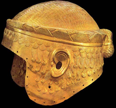 Шлем царя Мескаламдуга из Царских гробниц в Уре. Изготовлен из электра — сплава золота с серебром. Ок. 2550 до н.э. Иракский музей, Багдад.