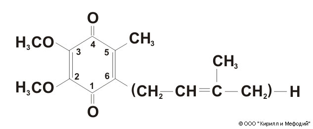 Структурная формула убихинонов. Различаются по числу изопреновых звеньев (от 6 до 10).