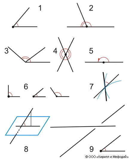 Углы: 1 — общего вида; 2 — смежные; 3 — прилежащие; 4 — вертикальные; 5 — развернутый; 6 — прямой, острый и тупой; 7 — между кривыми; 8 — между прямой и плоскостью; 9 — между скрещивающимися прямыми (не лежащими в одной плоскости прямыми).