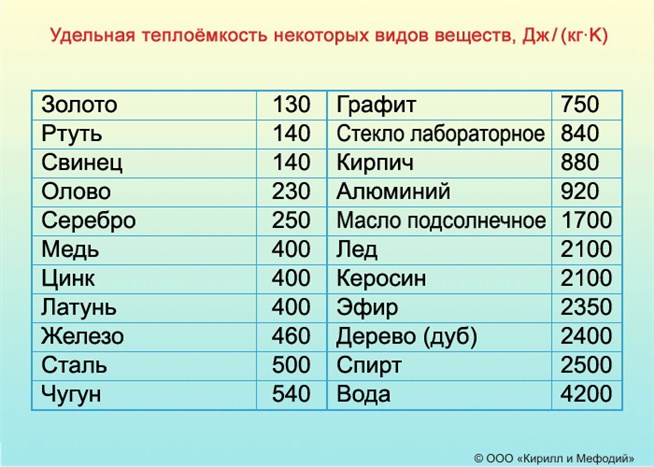 Удельная теплоемкость вещества показывает количество энергии, которую необходимо сообщить/отобрать, для того, чтобы увеличить/уменьшить температуру одного килограмма вещества на один градус Кельвина.