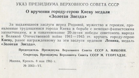 Указ Президиума Верховного Совета СССР от 8 мая 1965 г. «О вручении городу-герою Киеву медали «Золотая звезда». Ведомости Верховного Совета СССР №19 (1965)