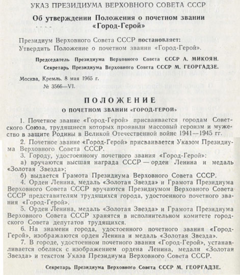 Указ Президиума Верховного Совета СССР от 8 мая 1965 г. «О утверждении Положения о почетном звании «Город-герой». Ведомости Верховного Совета СССР №19 (1965)