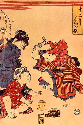 «Играющие дети». Композиция школы Укие-э. Гравюра на дереве «укие-э» («искусство быстротекущего, бренного, изменчивого мира») — нарядная и яркая, дешевая и легко тиражируемая. Она стала одним из важных звеньев в изобразительном искусстве Японии. Период рассвета «укие-э» — конец 18-первая половина 19 вв. Гравюра охватывала все сферы жизни горожан, она служила театральной афишей и книжной иллюстрацией, поздравительной открыткой и картиной-пейзажем.