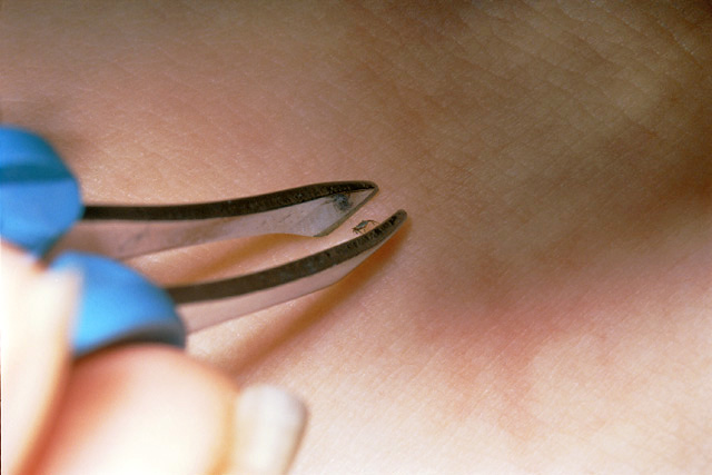 Захватив клеща пинцетом или пальцами, обернутыми в марлю, его извлекают медленными, плавными движениями.