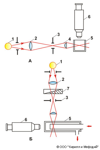 Принципиальные схемы щелевого (а) и поточного (б) ультрамикроскопов: 1 — источник света; 2 — конденсатор; 3 — оптическая щель; 4 — осветительный объектив; 5 — кювета; 6 — наблюдательный микроскоп; 7 — фотометрический клин.