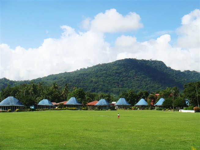 Традиционные хижины — фале (с синими крышами) на острове Уполу. Западное Самоа. 2010 год. Фото: Teinesavaii, wikimedia.org
