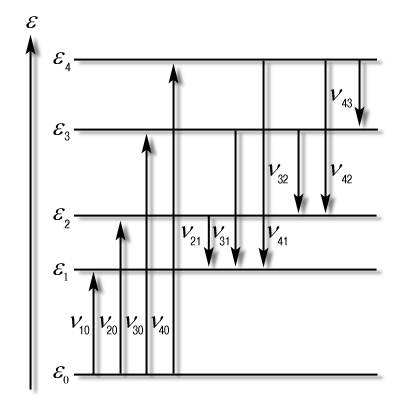 Уровни энергии квантовой системы; стрелками показаны квантовые переходы между ними.