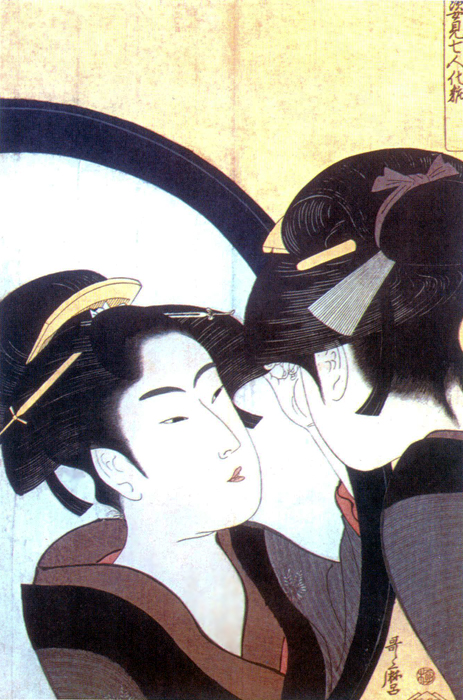 Утамаро. Красавица перед зеркалом. Конец 18 века. Цветная гравюра на дереве. Частная коллекция.