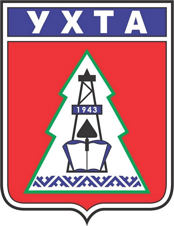 Герб Ухты был принят 20 сентября 1979 года. На красном поле щита изображены зеленый контур ели, внутри него черная буровая вышка с датой образования города, бело-синяя раскрытая книга, черный мастерок. В нижней части контура ели синий национальный орнамент.
