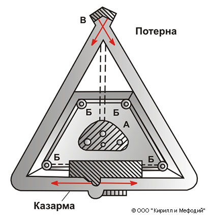 Тип броневого форта: а — центральный бетонный массив; б — башни для скорострельных пушек; в — законтрэскарповый капонир.