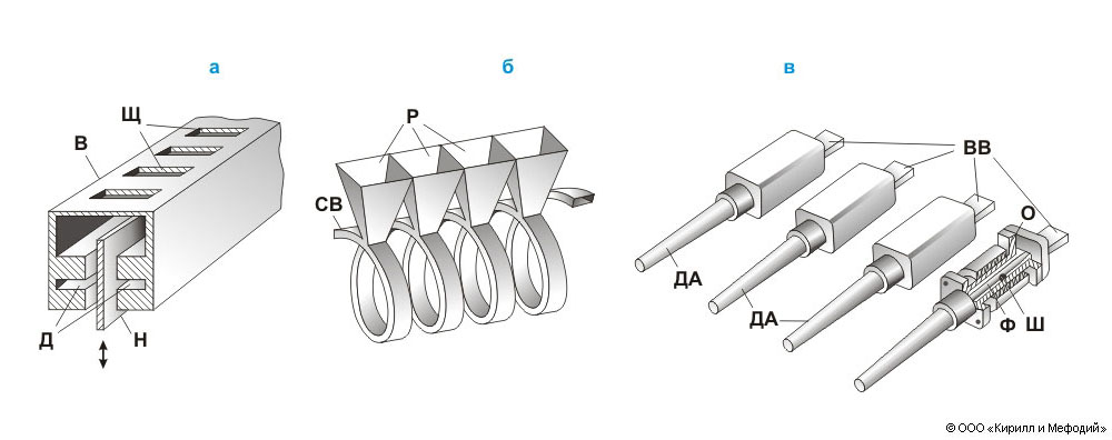 Примеры фазированных антенных решеток с электромеханическим (а), частотным (б) и электрическим (в) сканированием: Щ, — щелевые излучатели; В — прямоугольный возбуждающий волновод; Н — продольная пластина (нож) с управляемой глубиной погружения в волновод (служит для изменения фазовой скорости волны в волноводе); Д — дроссельные канавки; Р — рупоры; СВ — спиральный волновод; ДА — диэлектрические стержневые антенны; Ф — ферритовый стержень фазовращателя; ВВ — возбуждающие волноводы; О — управляющая обмотка фазовращателя; Ш — диэлектрическая шайба.