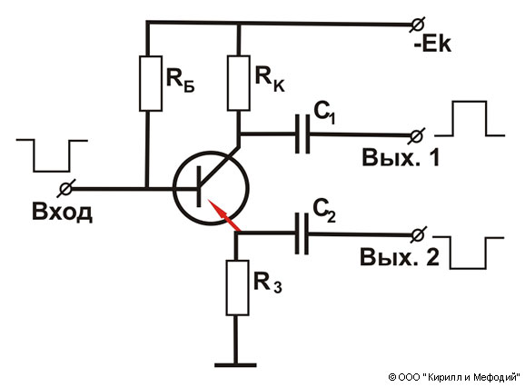 Принципиальная схема фазоинвертора с разделенной нагрузкой: Т — транзистор; Rб, Rк, Rэ — резисторы в цепях смещения, коллектора и эмиттера; С1, С2 — разделительные конденсаторы; Ек — источник питания.